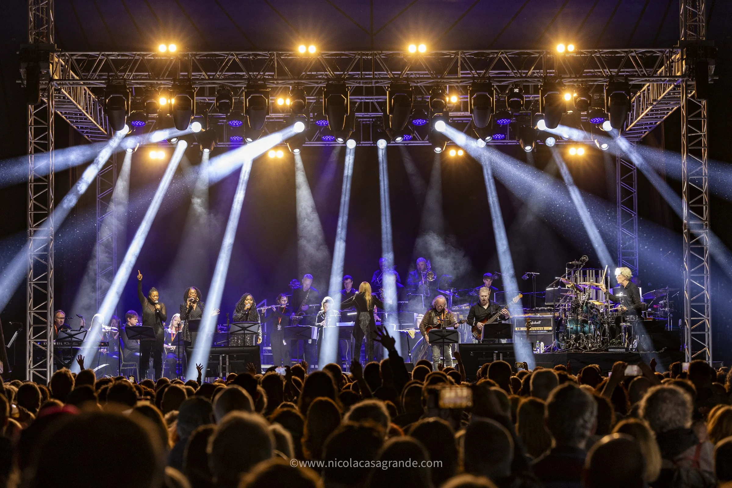 An outdoor concert stage with a large ensemble of musicians and singers performing under bright stage lights, audience in foreground